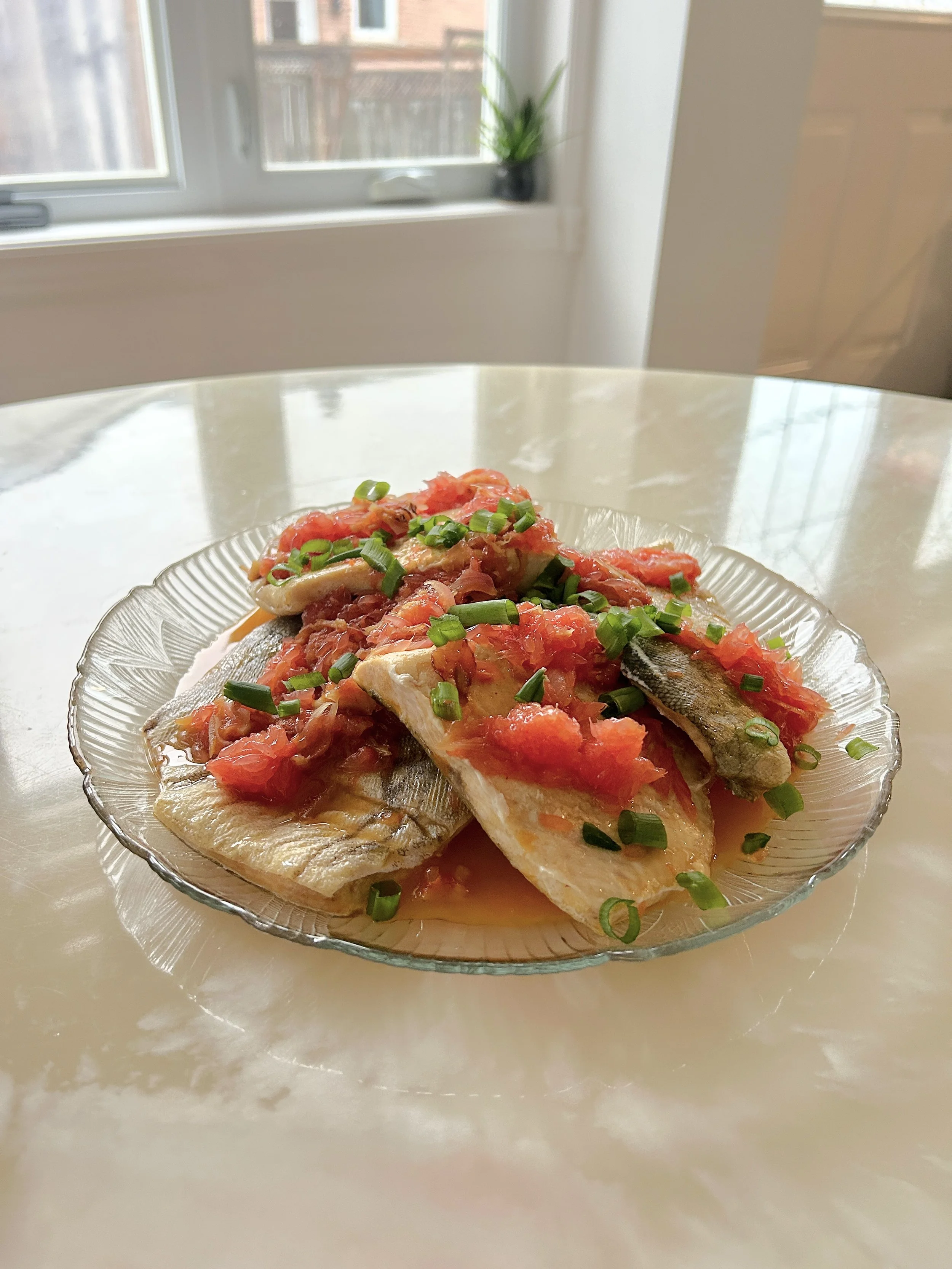 - Place the Lake trout on a serving dish, spoon the sauce over it, and top with freshly chopped green onions.