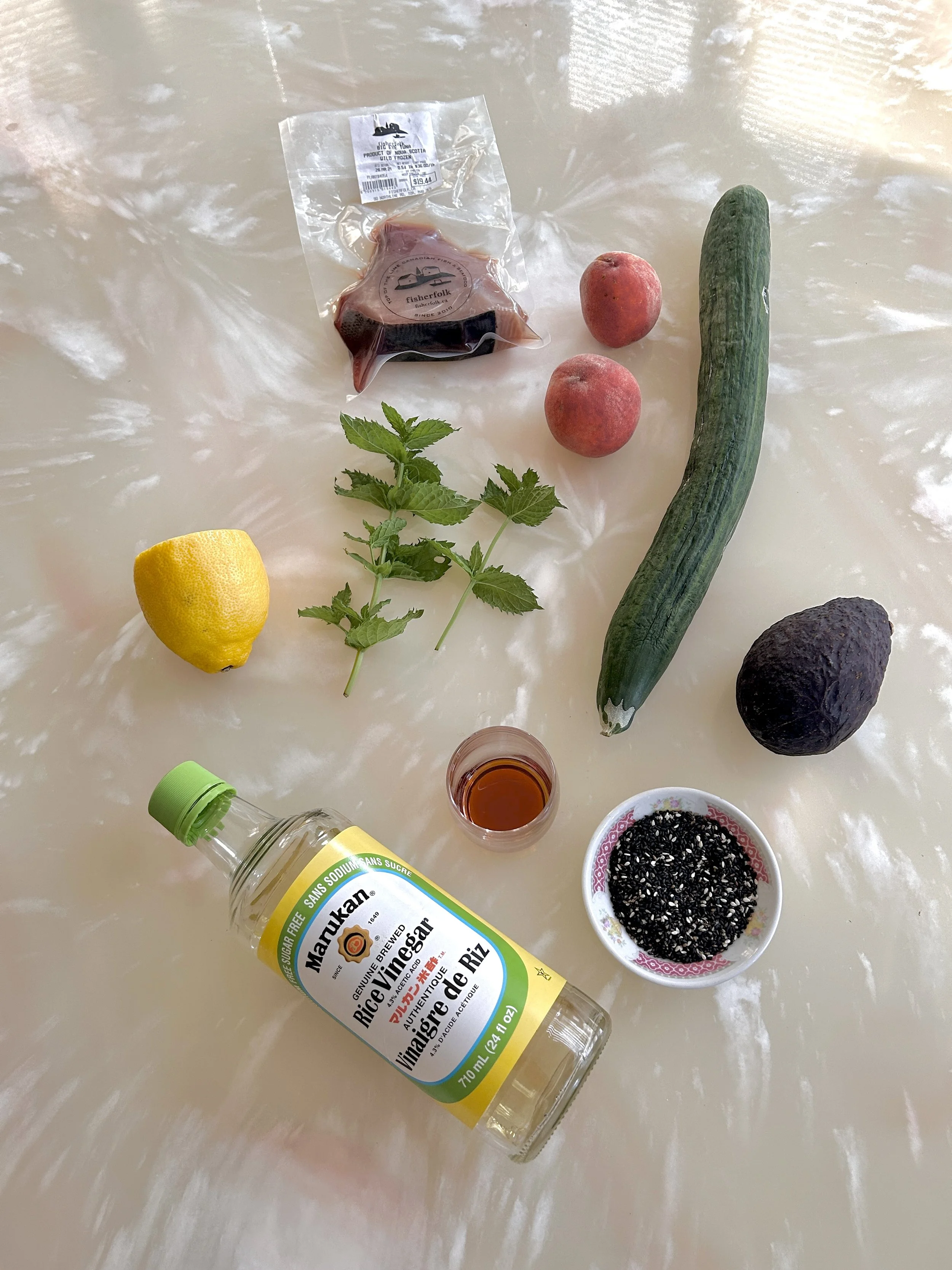 In a bowl, toss together cucumber, peaches, avocado, and mint. Add rice vinegar, lemon juice, olive oil, and a pinch of salt. Mix gently and set aside.Prep Tuna: